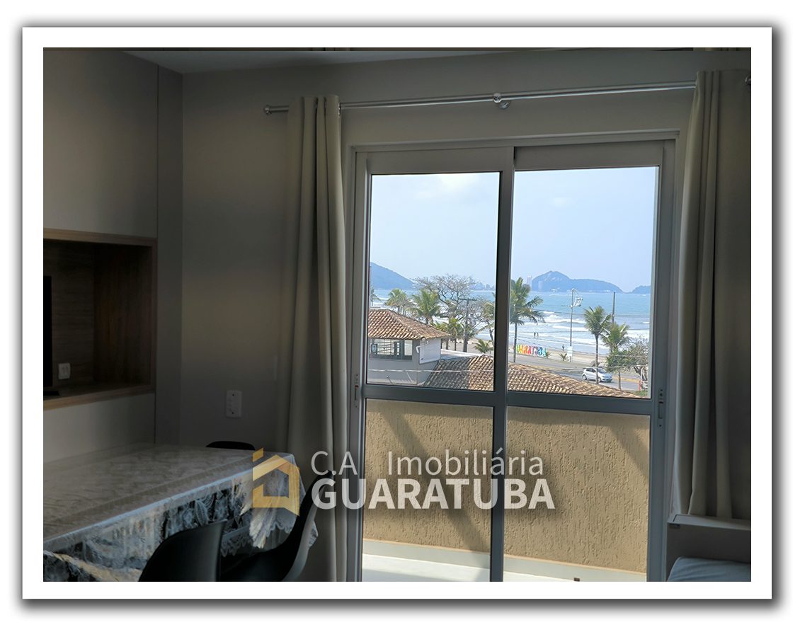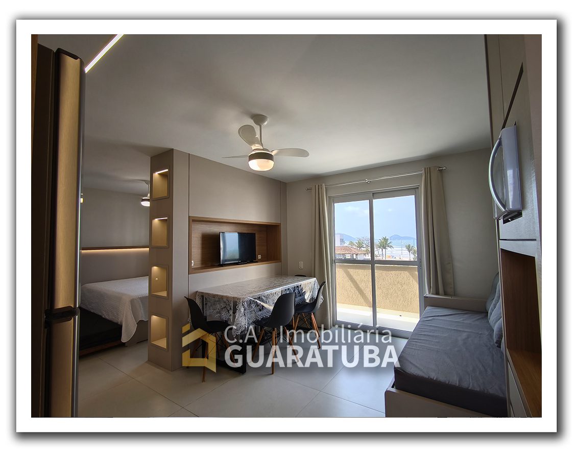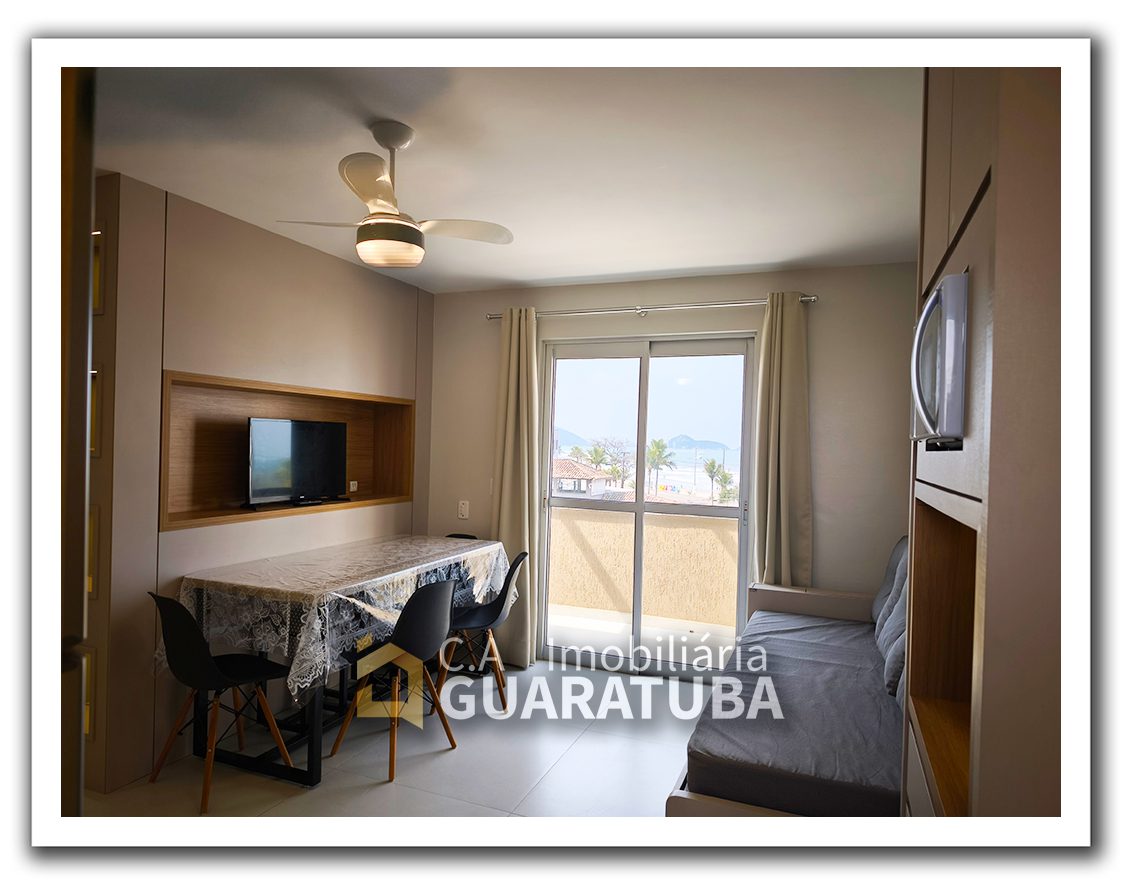 Quitinete na Praia Central para 4 pessoas. Contendo 1 quarto, sala/cozinha, banheiro, sacada e garagem para 1 carro pequeno.